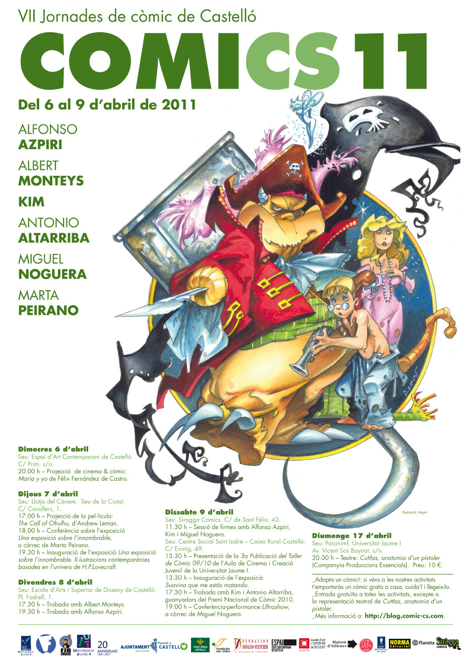 Ciencia ficción, terror, surrealismo y humor. Mucho humor. No hablamos de Castellón en si, aunque lo parezca, sino de las VII Jornadas de Cómic de Castellón, CòmiCS_11 , que este fin de semana llegan a sus platos fuertes con la presencia, este viernes 8 de abril, de dos grandes figuras del tebeo nacional como Azpiri y Monteys, ex director de la revista El Jueves. Después de haber inaugurado ayer jueves en la Llotja del Cànem la interesantísima exposición dedicada al norteamericano Howard Phillips Lovecraft -a quien también se le dedicó una conferencia y una proyección-, considerado uno de los pioneros en los relatos de terror y ciencia ficción de princípios del siglo XX a nível internacional, CòmiCS_11 afronta sus dos últimas jornadas cargado de estimulantes propuestas, desde conferencias y encuentros con los mencionados dibujantes pasando por una nueva exposición de cómics dedicada a la Suavina (si, la popular pomada) y hasta la esperada actuación del performer y humorista Miguel Noguera. Sin hacer mucho ruído, tirando de constancia y criterio, los colectivos Fanzone y Freaks in Black y el Aula de Cinema i Creació Juvenil de la UJI están consolidando una prestigiosa y divertida cita con el mundo del comic que es un auténtico lujo en la agenda local y de la que ya se empieza a hablar fuera de aquí. Con el apoyo de la Universitat Jaume I de Castellón, el Ayuntamiento de Castellón, la Fundación Dávalos-Fletcher, Caja Rural Castellón, el Espai d’Art Contemporani y la Escola d’Art i Superior de Disseny.