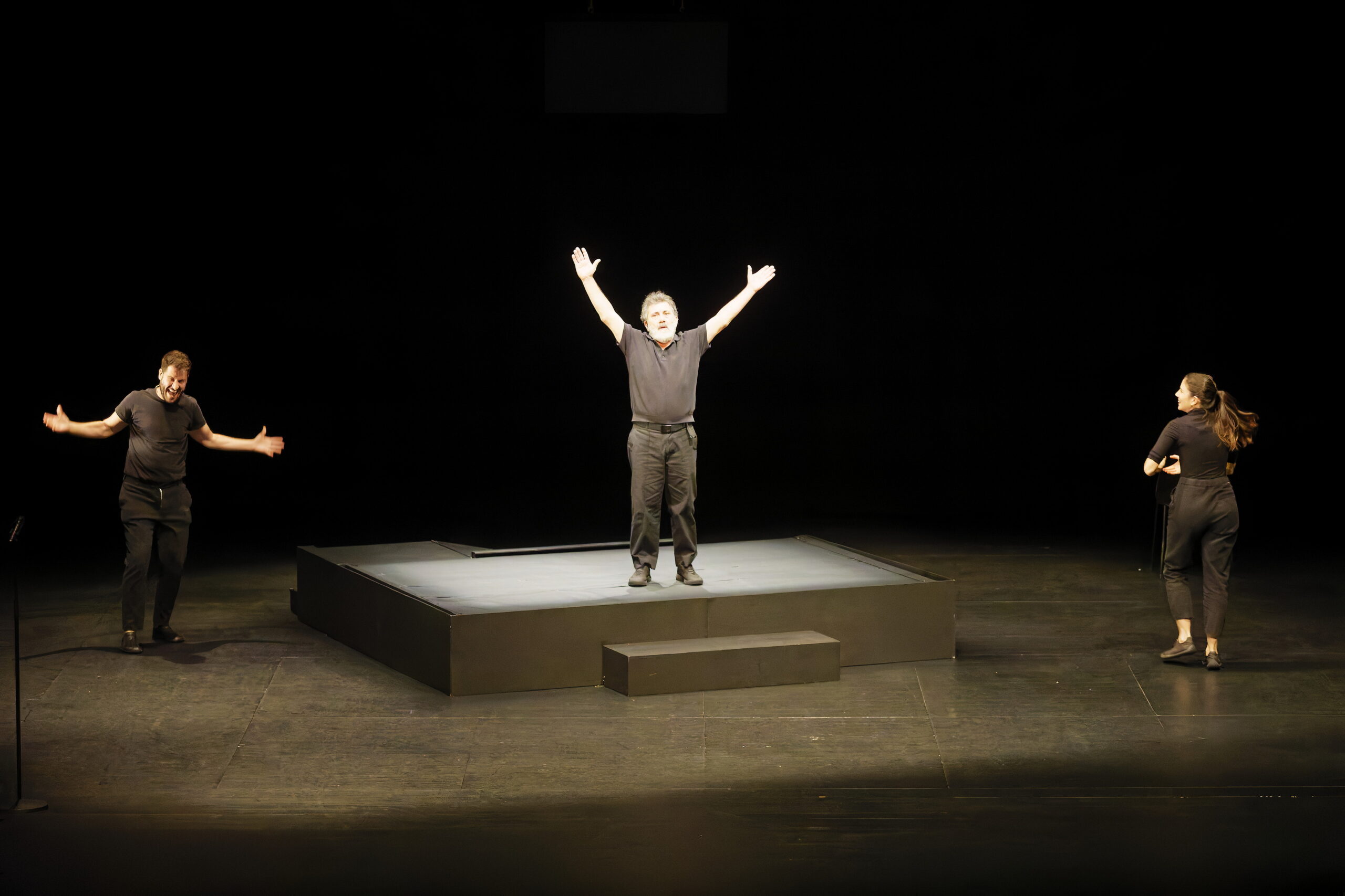 Pablo Gallego (izquierda), Toni Misó y Andrea Jiménez, al final de 'Casting Lear', en el Paranimf de la UJI. Foto: Antonio Pradas.