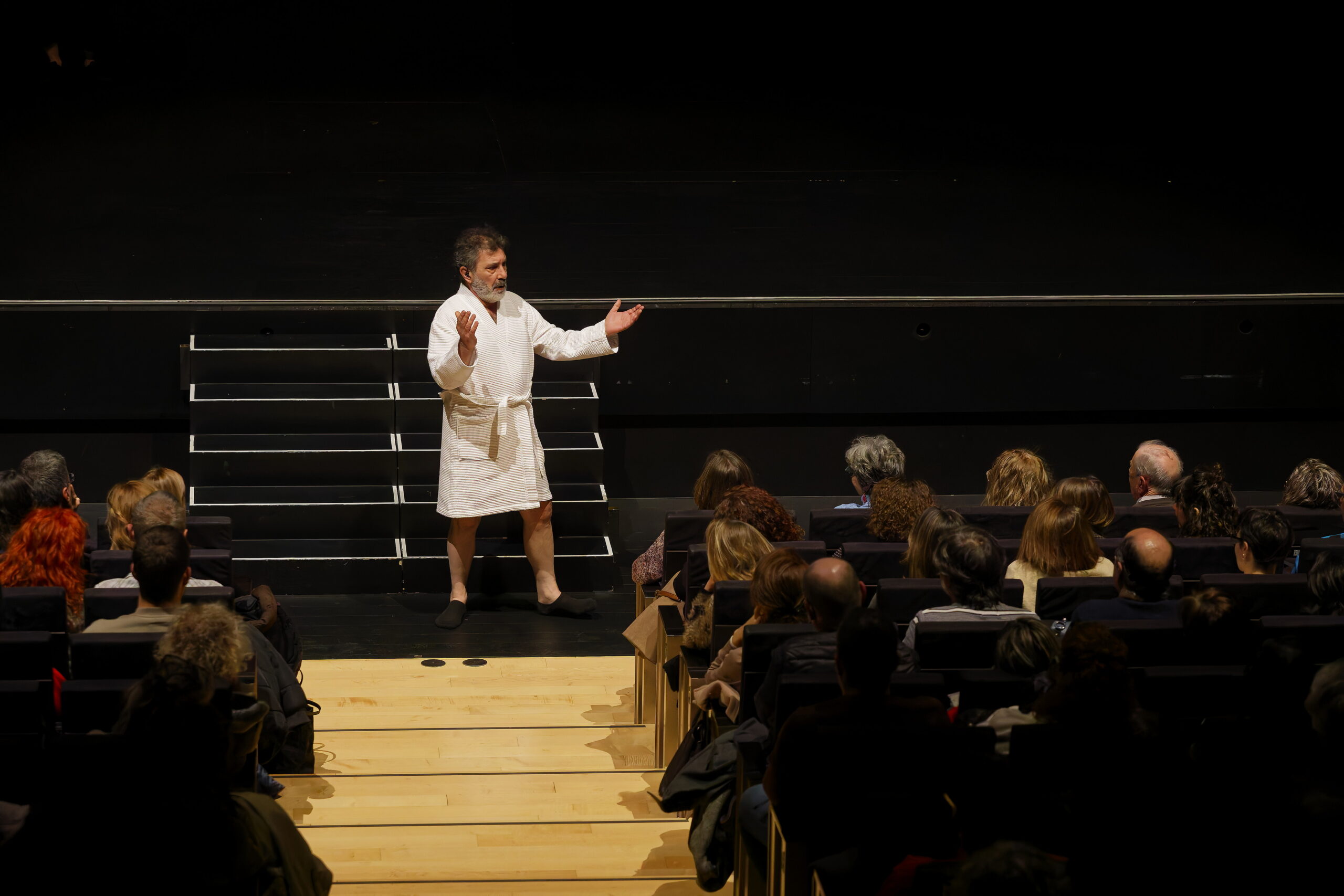 Toni Misó/Rey Lear rompe la invisible frontera del escenario para dirigirse al público. Foto: Antonio Pradas.