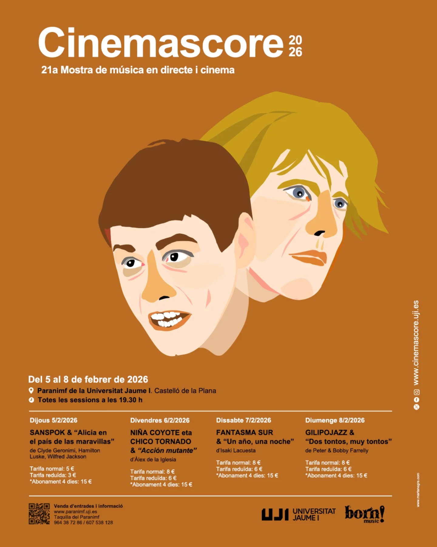 A este bloque más reflexivo se suma la proyección del clásico de animación Alicia en el país de las maravillas, que abrirá la muestra con música en directo de la banda castellonense Sanspok. El cierre llegará de la mano de Gilipojazz, que acompañará Dos tontos muy tontos de Peter & Bobby Farrelly, reforzando el tono de humor que siempre ha atravesado Cinemascore. Cada proyección comenzará a las 19:30 horas, con la posibilidad de adquirir un abono por 15 euros o entradas por día.