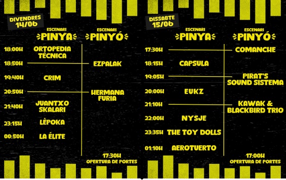 La fórmula del cartel es muy similar a la del pasado año, con punk a cargo de Crim o El Último Ke Zierre, por ejemplo; folk-metal con Lèpoka, pero también ondas más electrónicas, como las de La Élite, conduciendo a un punk del siglo XXI, reggae y ska con Juantxo Skalari... . Un paseo por buena parte de las vertientes del rock más potente, junto con una vertiente más moderna, en el verde paraje natural del Pinar del Grau de Castelló. A continuación te desglosamos el cartel.