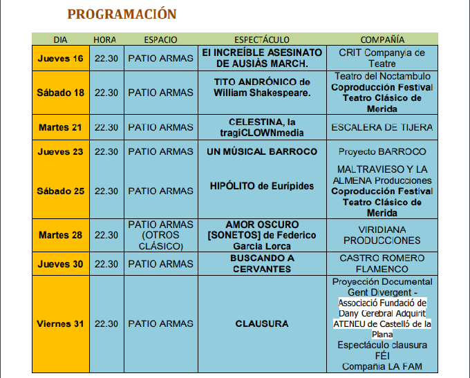 El cartel se rellena con El increíble asesinato de Ausiàs March, por CRIT (jueves 16); Tito Andrónico de William Shakespeare, por Teatro del Noctámbulo (sábado 18); Celestina, la tragiCLOWNmedia, por Escalera de Tijera (martes 21); Un musical barroco, por Proyecto Barroco (jueves 23); Hipólito de Eurípedes, por Maltravieso y La Almena (sábado 25); Amor oscuro (Sonetos) de Federico García Lorca, por Viridiana Producciones (martes 28); Buscando a Cervantes, por Castro Romero Flamenco (jueves 30); y el espectáculo de clausura, con la proyección de un documental de la Associació Fundació de Dany Cerebral Adquirit Ateneu de Castelló y el espectáculo de La Fam titulado Féi (viernes 31).