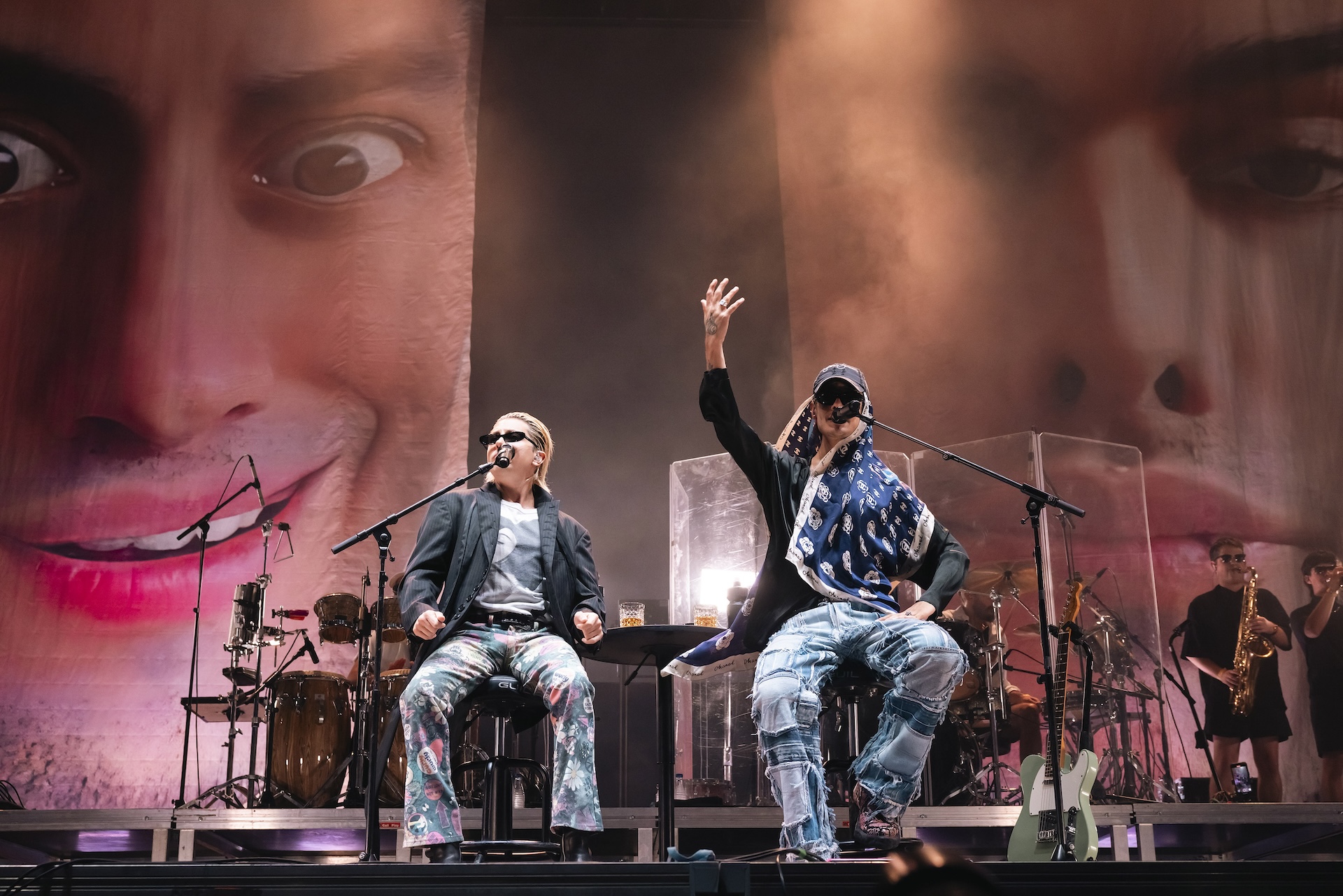A la cabeza de ellos, Ca7riel & Paco Amoroso. “Dumbai” para empezar, sentados sobre taburetes con dos tanganazos de -algo que parecía- whisky y acompañados de una banda con todos los extras: dos baterías marcando la pauta, sección de viento y un sonido excelente. Una primera parte tirando a latin-jazz, caribeña y dulzona, que descolocó a más de uno, pero que fue puro flow y que terminó evolucionando por derroteros más funk y hip-hop con las canciones de su reciente disco, Papota, con temones como “Re Forro” y “El día del amigo”, con los que ya se levantaron y elevaron al público definitivamente, agitando su estupenda coctelera estilística urbana bonaerense. Conciertazo.