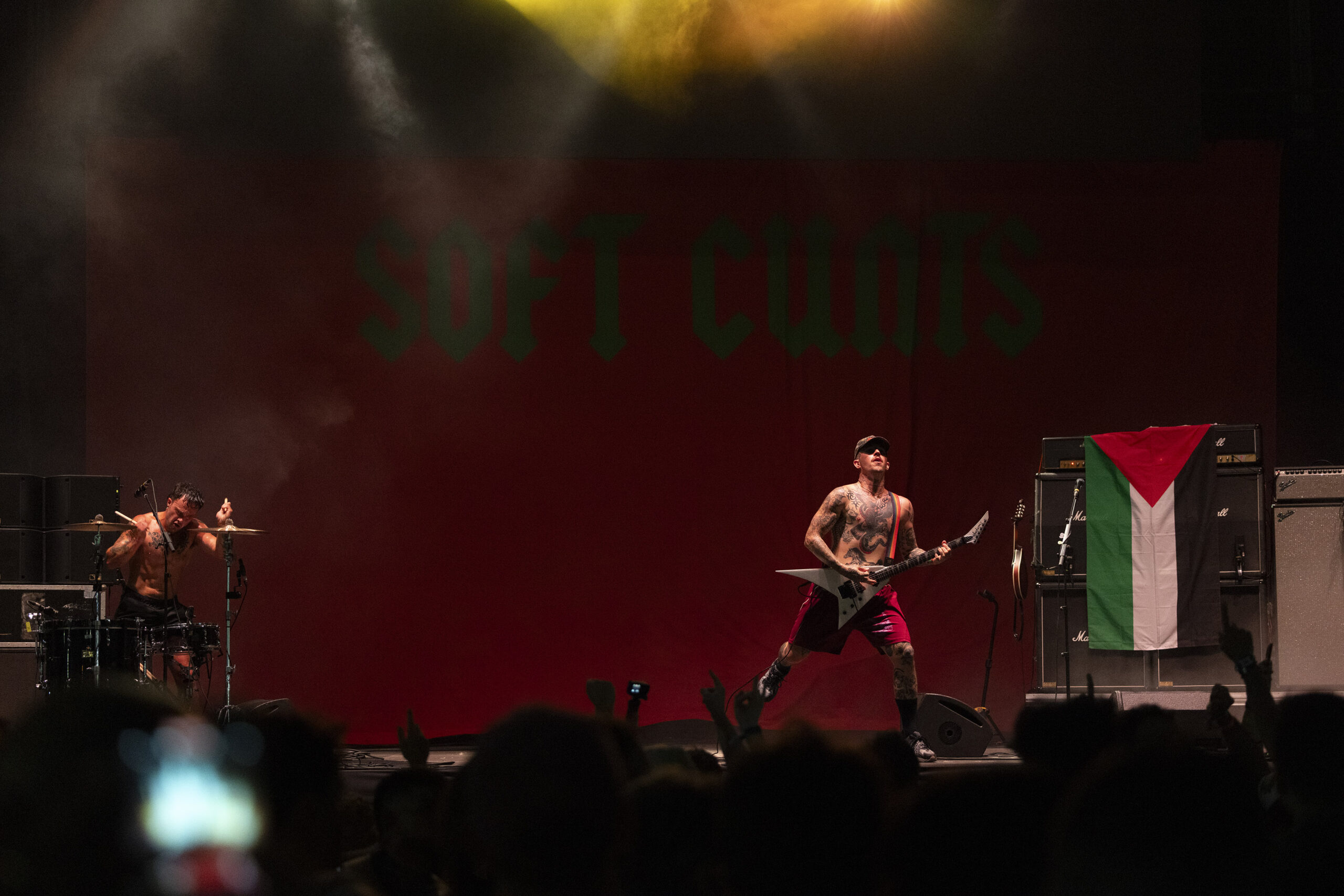 La sandía y lemas en camisetas, banderas de Palestina, pegatinas de “FCK KKR”, público coreando “Free, free Palestine” y hasta body painting; bandas españolas e inglesas como León Benavente, Soft Play, Love of Lesbian, La Habitación Roja, Shego o Mala Gestión realizando discursos más o menos elaborados a favor del pueblo palestino y contra el genocidio y la ocupación ilegal del Estado de Israel en Palestina. Previamente al festival, artistas como Residente, Califato ¾ (a quienes teníamos muchas ganas de ver después de sus grandes conciertos en el Emac de Burriana), Judeline, La Élite, Jimena Amarillo o Camellos se habían bajado del cartel en señal de protesta, con comunicados en los que se notaba que no había sido una decisión fácil. Un boicot que en redes sociales y en medios de todo signo ha tenido bastante repercusión.