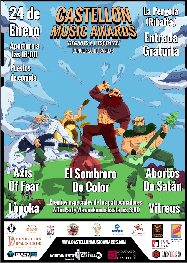 Castellón Music Awards Cartell final Publicado el 12/01/2015 a 635 × 893 en El Sombrero de Color, Abortos de Satán, Axis of Fear, Lèpoka y Vitreus disputarán la final del Castellón Music Awards en La Pérgola el sábado 24 de enero