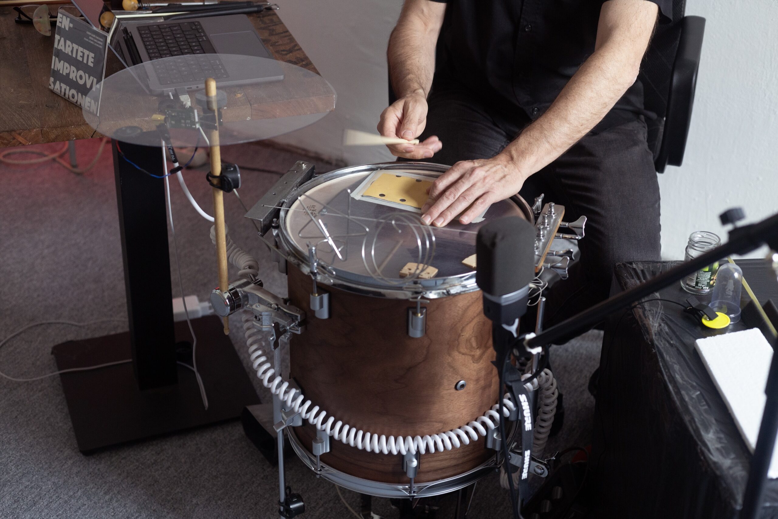 Timbal acústico deconstruido por Jesús Gallardo con la aplicación de la tecnología para obtener infinidad de sonoridades. Foto: GlogauAIR