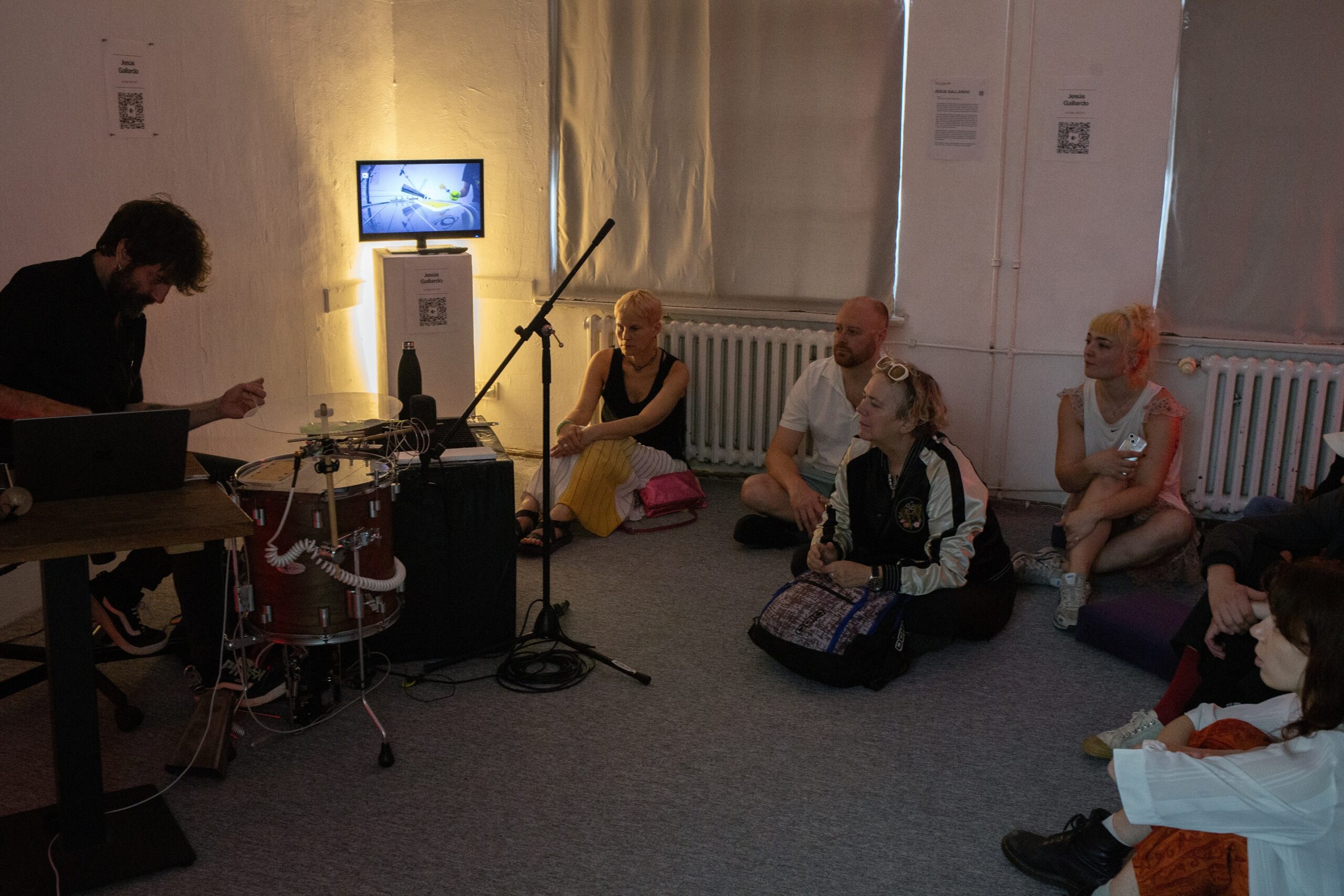 Esas sensaciones le llegan por lo experimentado durante los meses de abril, mayo y junio en Berlín, empezando por la misma residencia, GlogauAIR, "donde había tres plantas llenas de artistas, algunos becados y otros no. Era el único músico. Allí me dedicaba a construir el timbal , pidiendo a la encargada lo que me hiciese falta, y tocar para mí o con público, como un Open Studio durante dos días enteros. Cada vez que llegaba alguien, yo tocaba. Allí me descubrió una galerista italiana con un espacio cultural en el centro de Berlín y puse la música a una inauguración de exposición. También toqué con una artista brasileña que usaba el theremin, acompañada por percusión. Además, participé en jams con músicos que no conocía, ya que te apuntabas y te tocaba al azar".