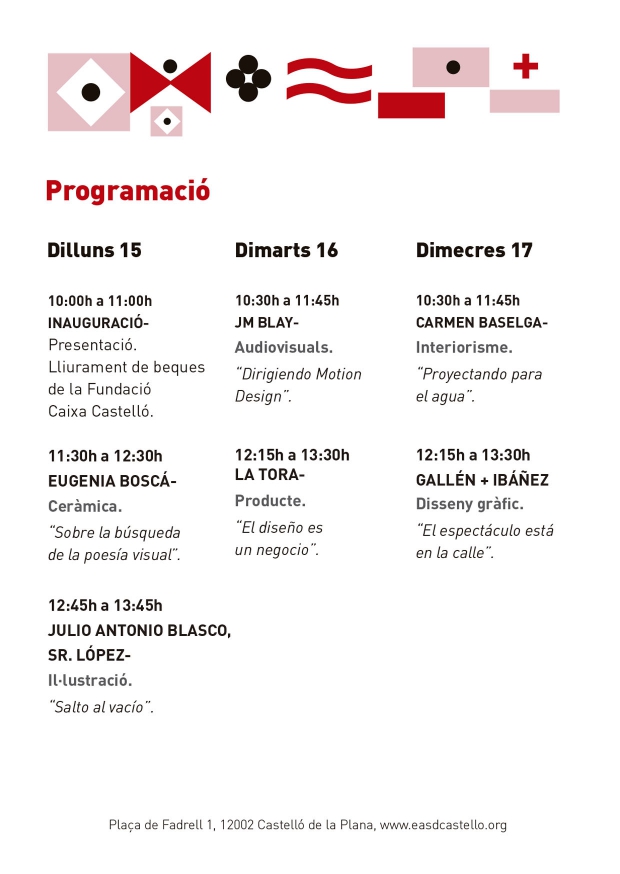 Eugenia Boscà también será una de las protagonistas de la programación de las charlas, encuentros y conferencias de la 19 Jornadas de diseño de la EASD, en este caso con coloquio Sobre la búsqueda de la poesía visual, centrado en la cerámica. Por la EASD pasarán más profesionales especializados en distintos campos del diseño y el arte para abordar cuestiones relacionadas con el interiorismo, con Julio Antonio Blasco (Salto al vacío), el mundo audiovisual con JM Blay (Dirigiendo Motion Design), sobre producto con La Tora (El diseño es un negocio), interiorismo con Carmen Baselga (Proyectando para el agua) y diseño gráfico con Gallén e Ibáñez (El espectáculo está en la calle).