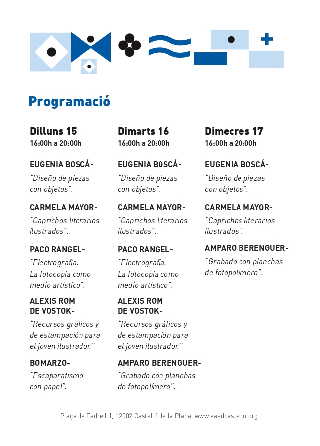 También la ilustradora y artista Carmela Mayor con un taller sobre escritura e ilustración: Caprichos literarios ilustrados; el artista multidisciplinar Paco Rangel, encargado de hablar sobre la técnica, funcionamiento y la elaboración de la obra electrográfica (Electrografía. La fotocopia como medio artístico); la experta en la aplicación del lenguaje fotográfico a los procesos gráficos Amparo Berenguer con el taller Grabado con planchas de fotopolímero sobre mecanismo para manejar la imagen digitalmente para traspasarla a planchas y el revelado, entra otras cuestiones; Escaparatismo con papel, taller en el que se abordarán distintas técnicas para realizar este tipo de decoraciones y que llevará la firma del laboratorio creativo y multidisciplinar Bombarzo; y Diseños de piezas con objetos, taller que impartirá Eugenia Boscà, destacada artista de artesanía de vanguardia, sobre la transformación de piezas de molde, uniones y deformaciones creativas.