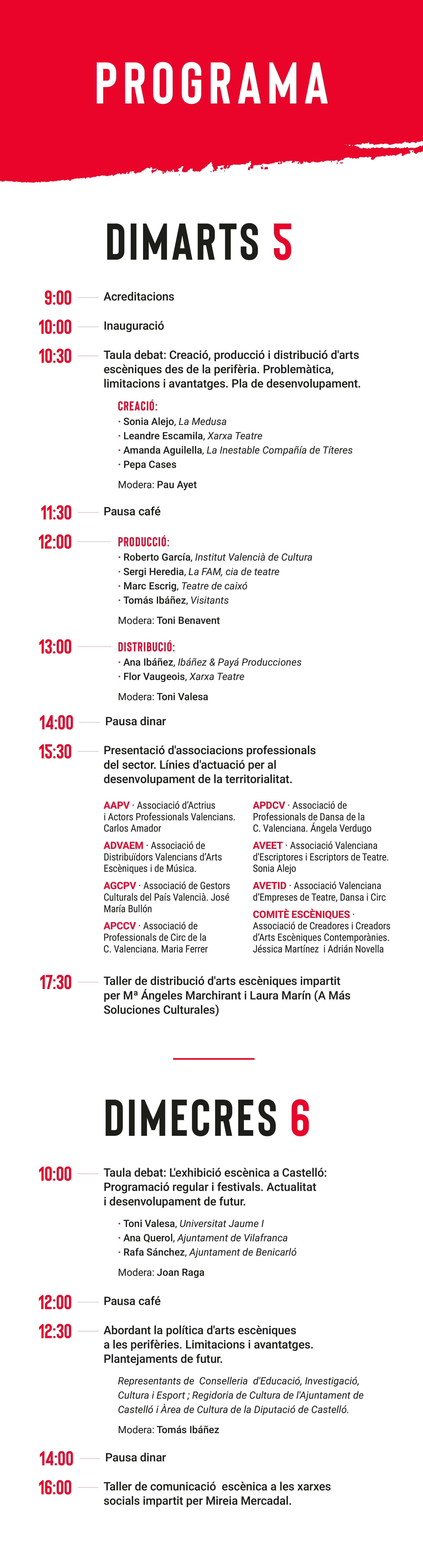 Las tres mesas de debate programadas para el martes por la mañana, a partir de las 10:30, girarán en torno a la problemática, limitaciones y ventajas de los procesos de creación, producción y distribución desde la periferia. Participarán representantes de las compañías castellonenses La Medusa, Xarxa Teatre, La Inestable Compañía de Títeres, La Fam, Teatre de Caixó, Visitants e Ibáñez & Payá Producciones, además de Roberto García, director adjunt d'Arts Escèniques del Institut Valencià de Cultura (IVC).