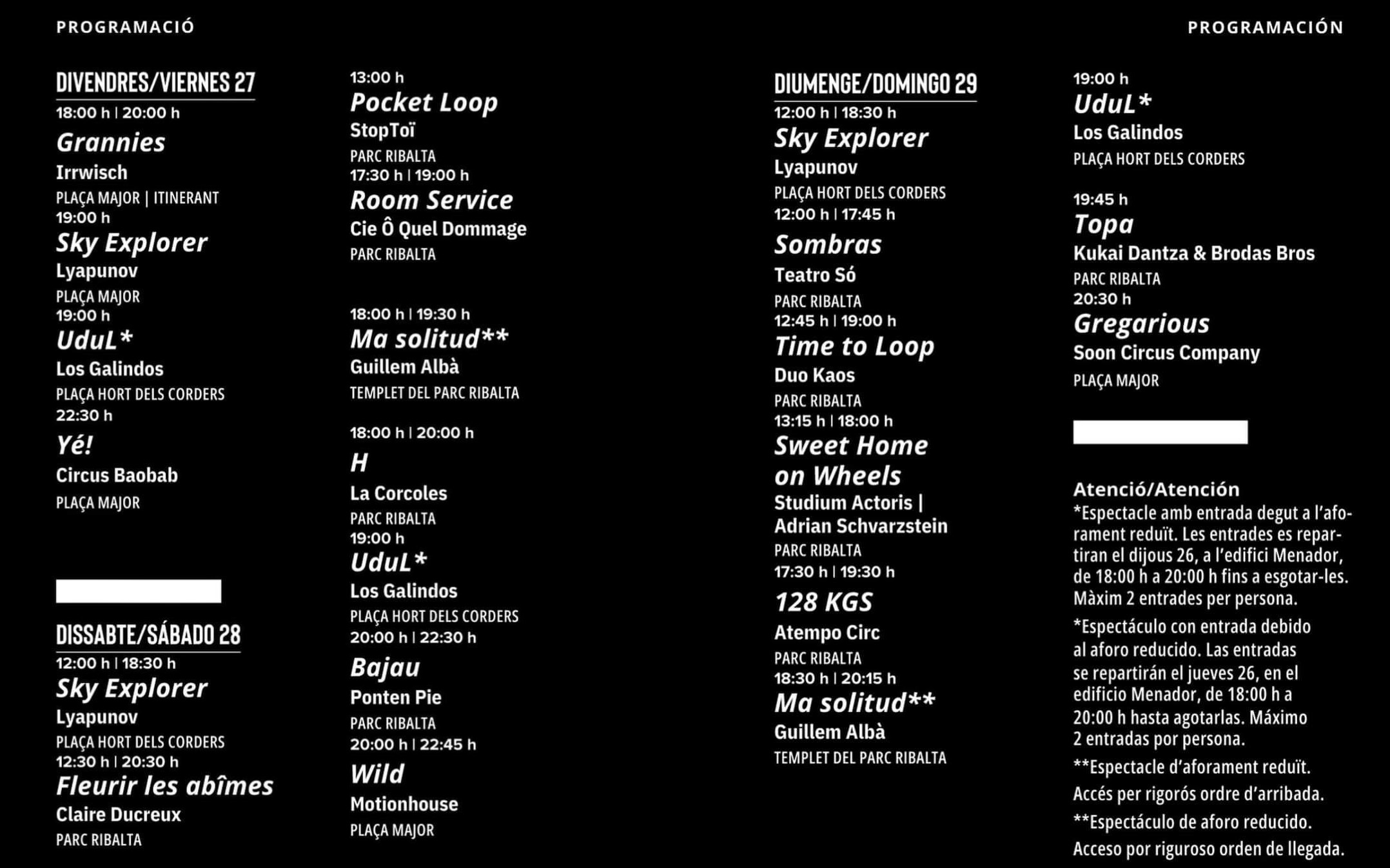 Además de los espectáculos previstos para cada uno de los días, la jornada del sábado presentará a la artista francesa-barcelonesa Claire Ducreux con Fleurir les abîmes, donde a través de la danza y una narrativa poética expresa el vínculo entre una mujer y un árbol en un mundo que se desmorona, simbolizando la resistencia. Se podrá ver en el parque Ribalta (12:30 y 20:30). En ese mismo espacio, a las 13:00, comenzará Perfect loop, una producción de circo y malabares a cargo de la compañía franco-hispano-israelí Stoptoï en busca de encontrar la belleza de lo cotidiano.