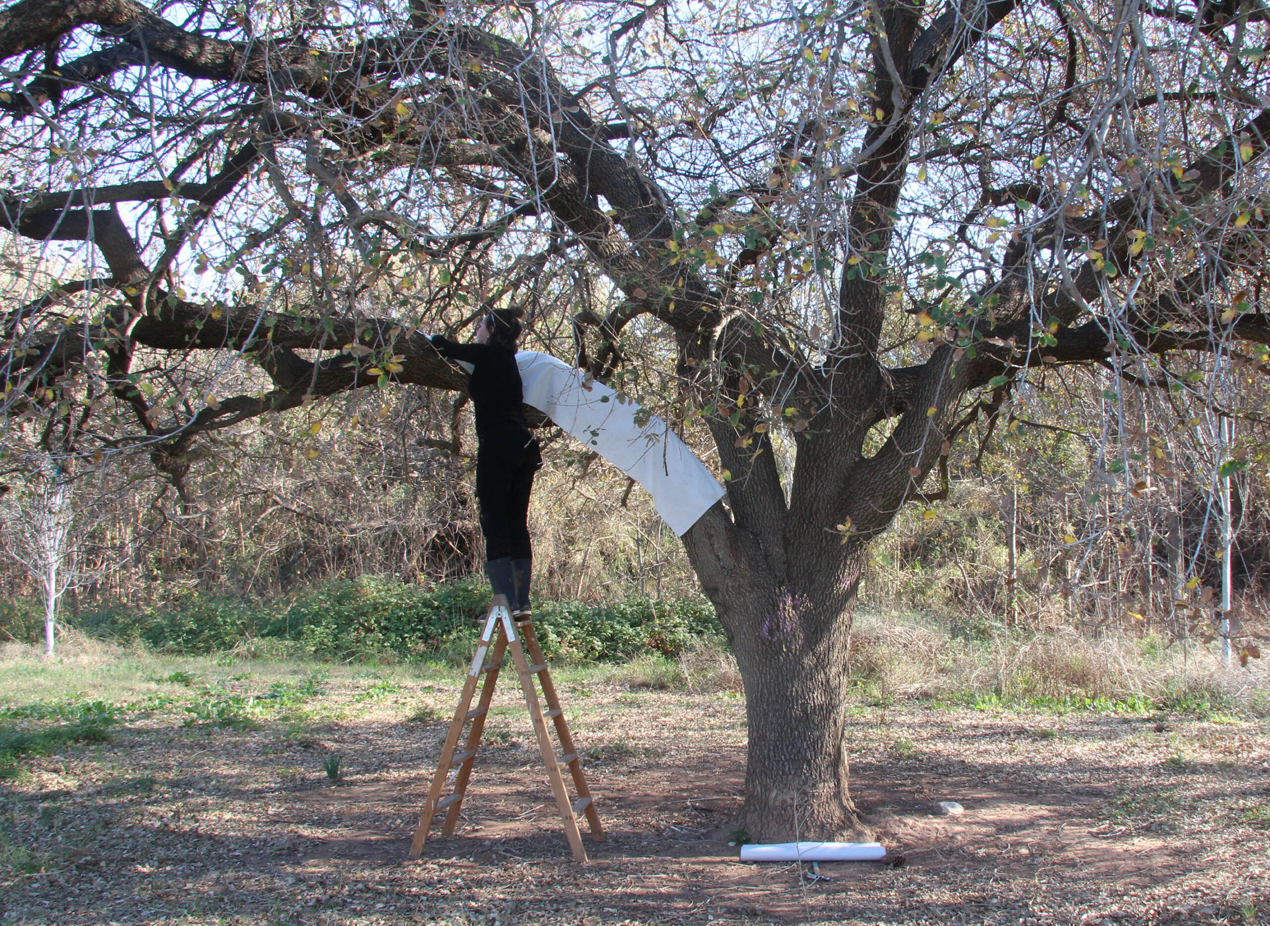La artista María Esteve haciendo la técnica del frottage en un árbol.