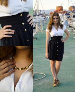 Como en el fondo somos unos clásicos, en verano nos trasladamos al Grau a disfrutar de la brisa, las terrazas, las sardinas y, de paso, a ver qué se cuece por allí. Nos hemos dado una vuelta por el Club Náutico de Castellón y hemos encontrado a Patricia, una joven con un estilismo muy navy de lujo. Patricia nos demuestra que hay vida en la moda marinera más allá de las camisetas a rayas. El elemento principal de su conjunto es una falda de talle alto con botones dorados de Zara, muy retro-lux. La camisa blanca es un básico de Benetton de temporadas anteriores y las sandalias con cuña de Blanco. Destaca la gargantilla ochentera vintage de su madre, que seguro le hará brillar en las terrazas de verano. Confirmado: este verano tendremos que asaltar los joyeros de nuestras abuelas.