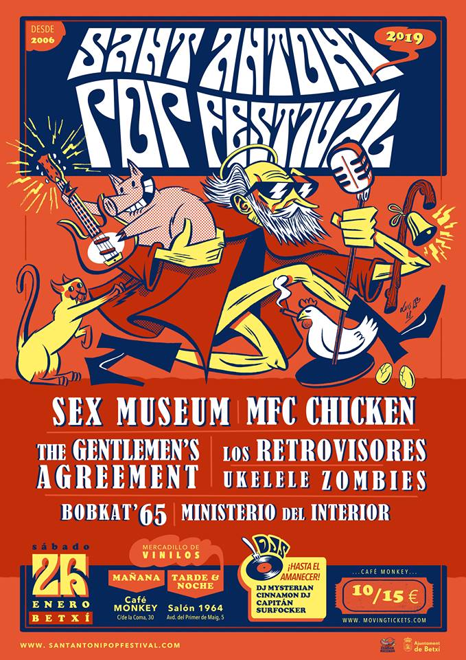 La fórmula del Sant Antoni Pop de Betxí es sencilla: rock and roll garagero y ganas de desmadrarse. No hace falta más. Con ella ha llegado ya a su 13ª edición. Aunque el proceso de organización es bastante más complejo y requiere de meses de trabajo a cargo de un grupo de amigos vinculados con Los Altragos, la banda portadora del emblema del garage en las comarcas de Castellón. En 2013 dieron el paso internacional que consideraban necesario para su festival y, como una especie de autoexigencia, lo han repetido cada año, optando en esta ocasión por los británicos MFC Chicken, con su universo lleno de pollos, y los franceses The Gentlemen's Agreements. Aunque por encima de ellos en el cartel de 2019 se sitúan los madrileños Sex Museum, con más de treinta años de experiencia y su reciente novedad discográfica Musseexum, Los Retrovisores, Bobkat'65, Ukelele Zombies y Ministerio del Interior completan el cartel que descargará el sábado 26 de enero desde el mediodía hasta las tantas de la madrugada.
