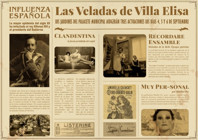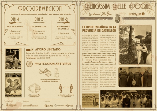 Benicàssim Belle Époque reduce su programación a consecuencia de la pandemia del coronavirus y consistirá en tres veladas, que tendrán lugar en Villa Elisa, en una cita retro en la que las medidas sanitarias de prevención serán el único anacronismo. Recordamos que el uso de la mascarilla, el distanciamiento social y la desinfección de manos mediante gel hidroalcohólico son hábitos de obligado cumplimiento para minimizar el riesgo de contagios por coronavirus. El aforo se ha limitado, por lo que si quieres acudir a una de las tres veladas, deberás realizar una inscripción previa llamando al número de la Oficina de Turismo (964 300 102). La reserva de plazas se podrá solicitar el mismo día de la actuación a la que quieras acudir a partir de las 10:30.